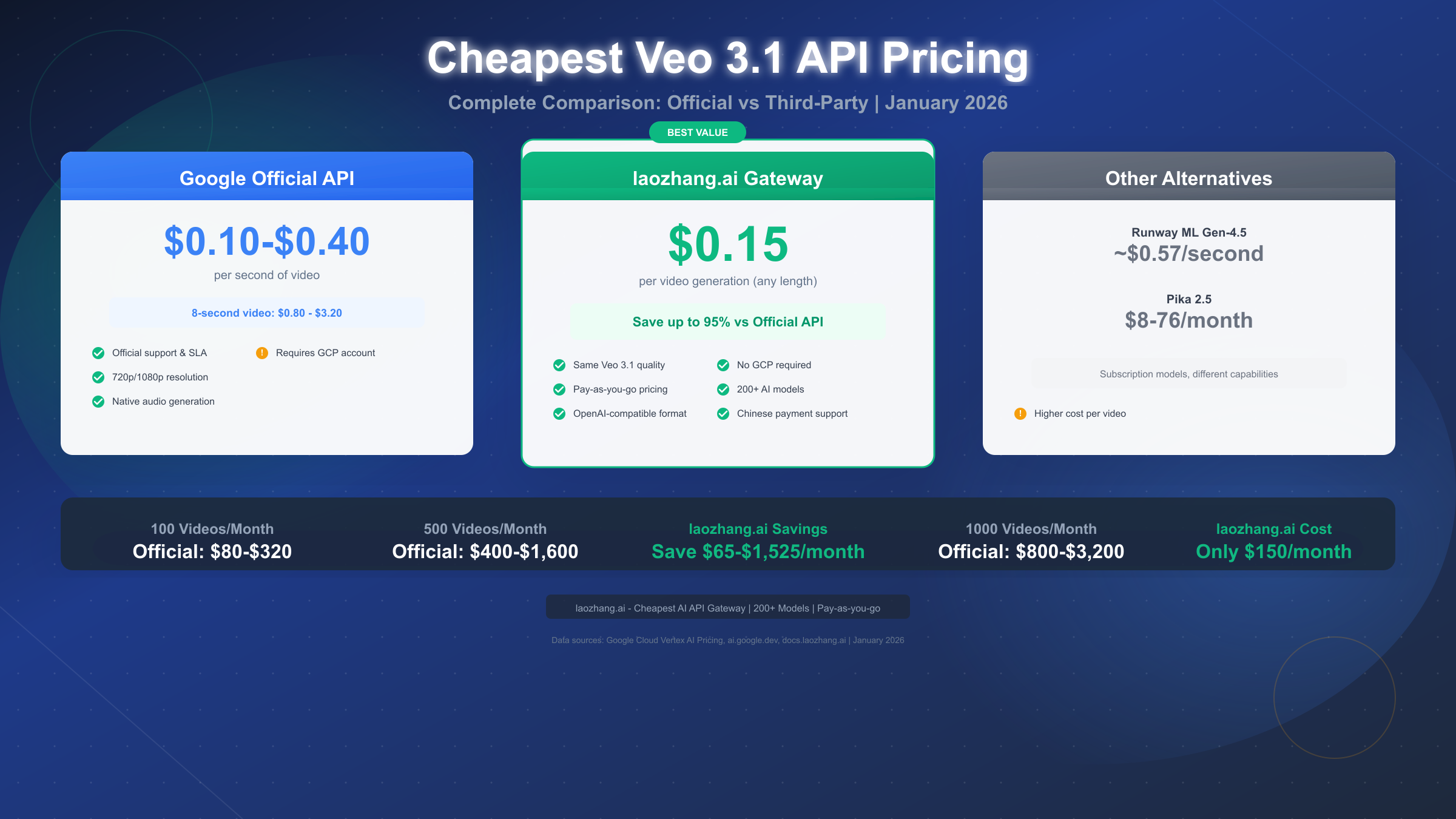 Third-party API gateways offer the lowest per-video costs. laozhang.ai charges $0.15 per video regardless of duration, representing up to 95% savings compared to standard official pricing.