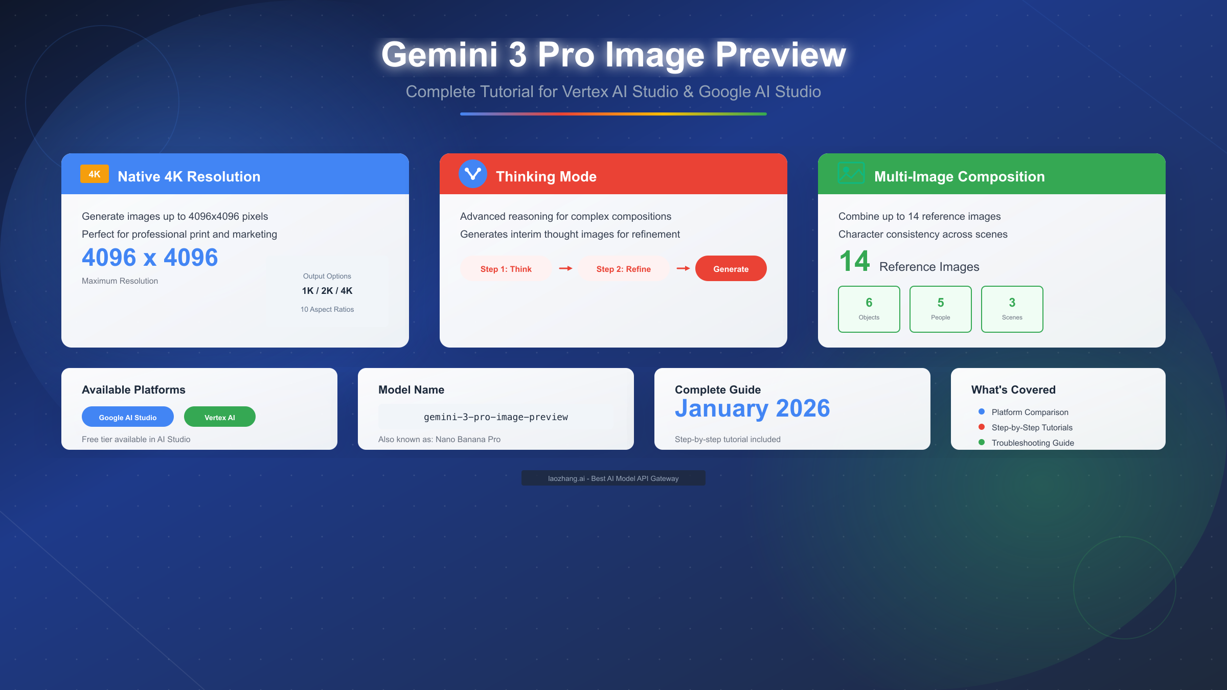 Gemini 3 Pro Image Preview represents Google's most advanced AI image generation model to date, offering capabilities that fundamentally change how creators and developers approach visual content creation. Launched as part of the Gemini 3 family and also known by its product name Nano Banana Pro, this model brings native 4K resolution support, an innovative thinking mode for complex compositions, and the ability to reference up to 14 images for unprecedented creative control. Whether you're a designer exploring AI-assisted workflows, a developer building image generation features, or a content creator seeking efficient visual production, this January 2026 guide provides everything you need to start generating professional-quality images in both Google AI Studio (free) and Vertex AI Studio (enterprise).