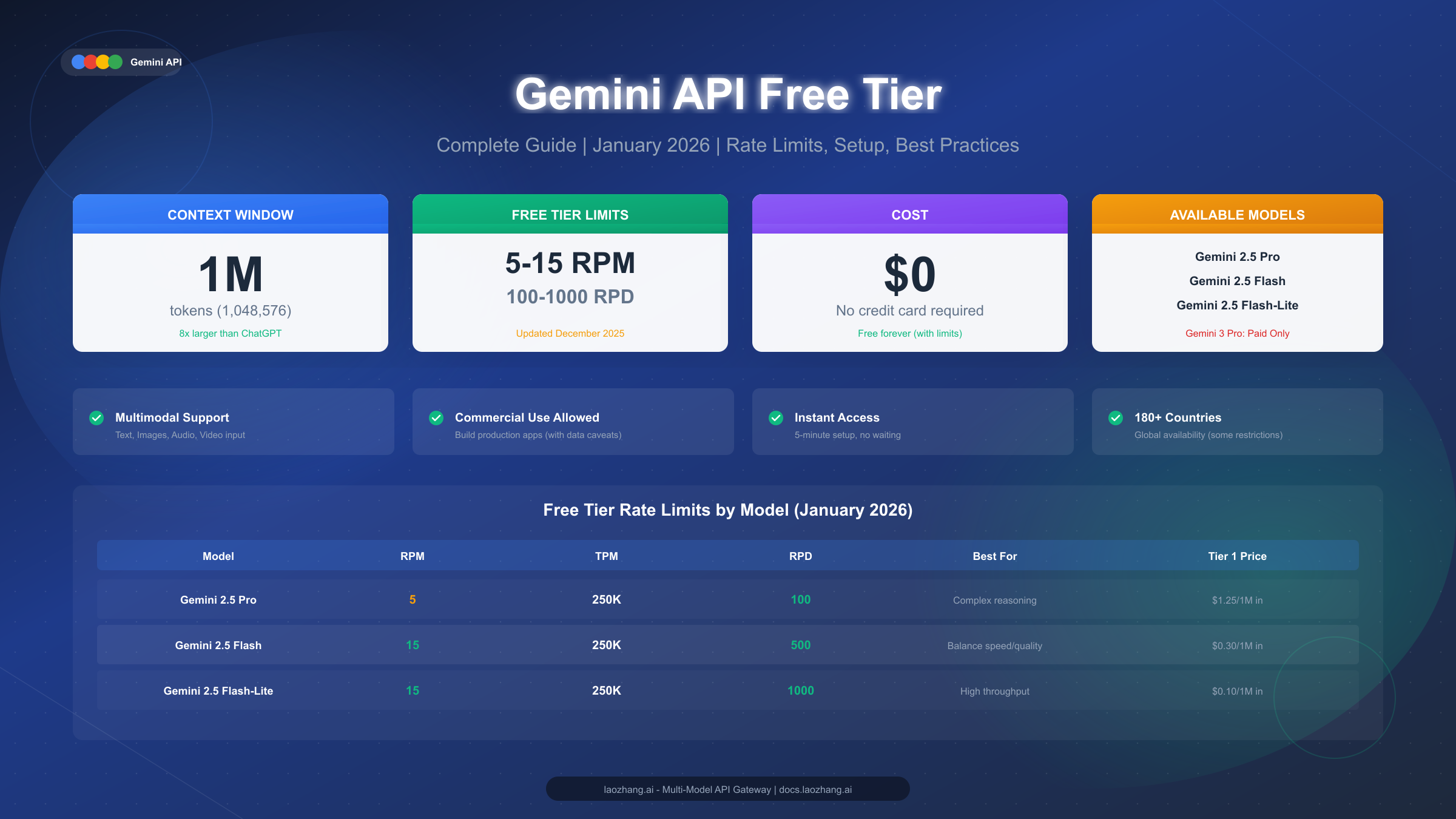 Google Gemini API offers a genuinely free tier that requires no credit card, providing developers with 5-15 requests per minute and 100-1,000 requests per day depending on the model. As of January 2026, the free tier includes access to Gemini 2.5 Pro, 2.5 Flash, and Flash-Lite models with a massive 1 million token context window—eight times larger than ChatGPT's 128K limit. Following the significant December 2025 quota reductions that caught many developers off guard, the free tier is now best suited for development, testing, and low-volume production rather than high-traffic applications. This comprehensive guide covers everything you need to know about using Gemini's free tier effectively in 2026.