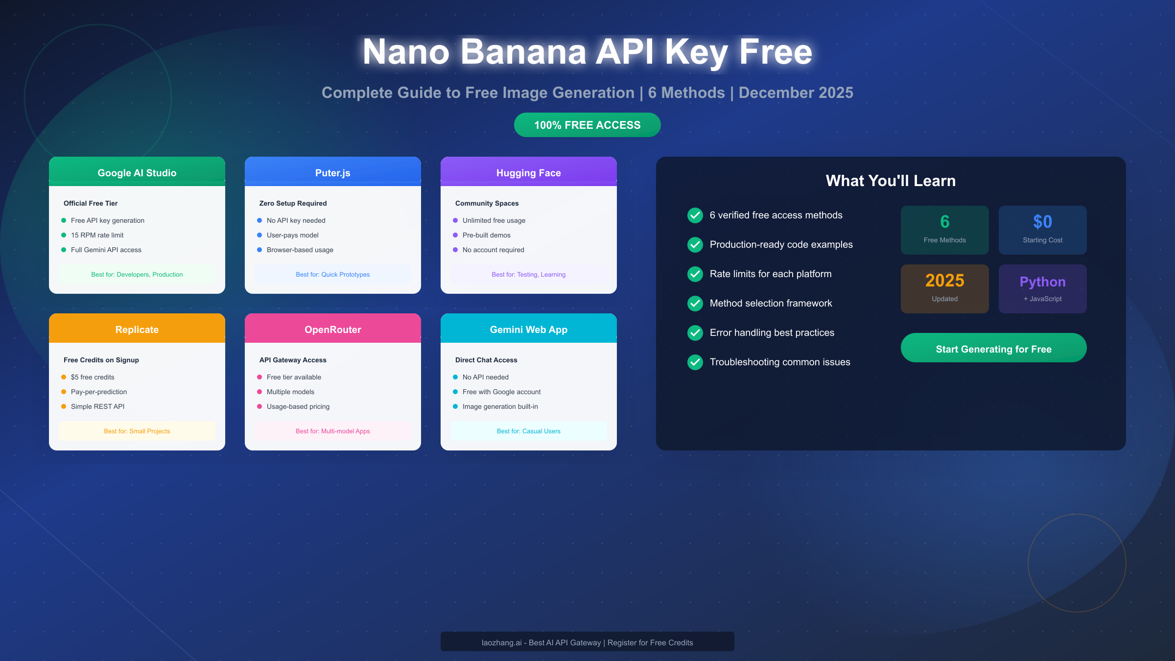 Nano Banana is Google's AI image generation model available through the Gemini API, and getting free access in December 2025 is straightforward through six verified methods. Whether you need official API access through Google AI Studio, zero-setup convenience with Puter.js, or unlimited experimentation via Hugging Face Spaces, this guide covers every legitimate free option with working code examples. Understanding the rate limits and choosing the right method for your specific use case can save you significant development time and unexpected costs down the road.