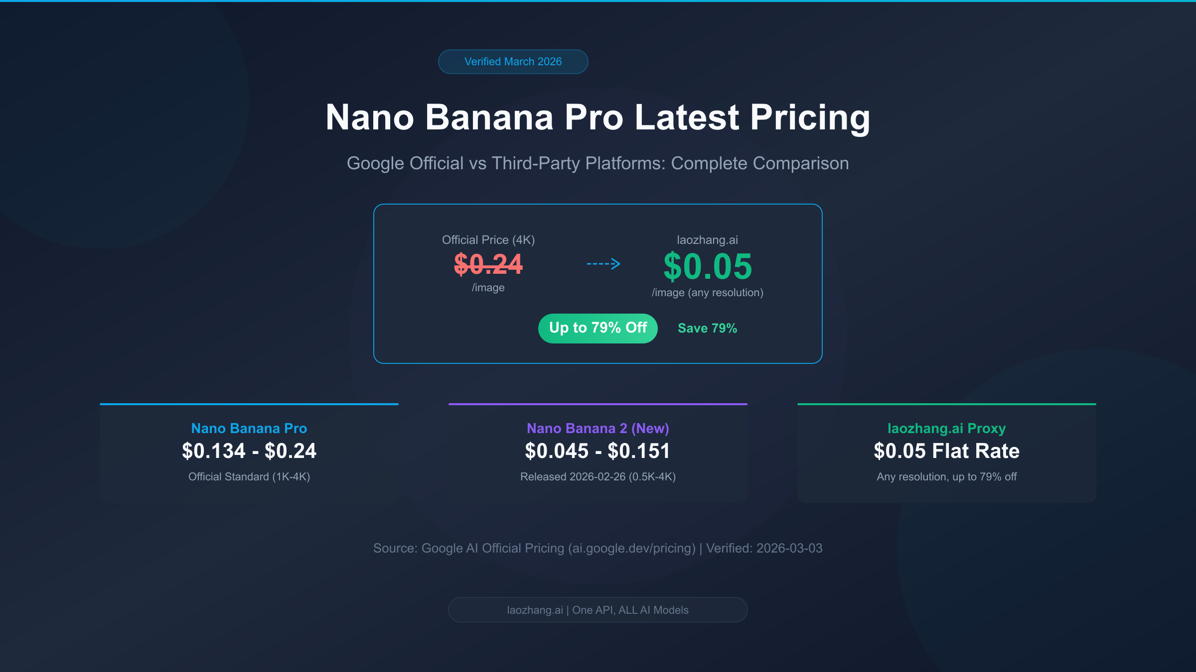 Nano Banana Pro is Google DeepMind's top-tier AI image generation model built on Gemini 3 Pro, renowned for its exceptional image quality and support for up to 4K resolution. As of March 2026, the official standard price ranges from $0.134/image (2K) to $0.24/image (4K), while the third-party API proxy platform laozhang.ai offers just $0.05/image regardless of resolution — equivalent to roughly 20% of the official 4K price, saving up to 79% (Google AI official pricing page, verified 2026-03-03).