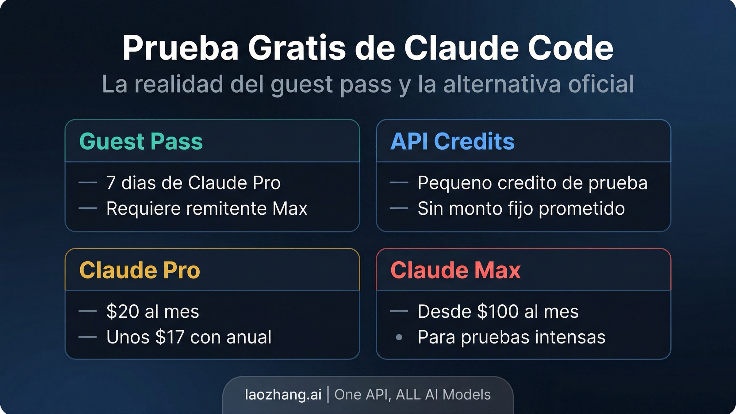 | Guest Pass | Quien puede conseguir invitación | 7 días gratis y luego conversión si no cancelas | Si la experiencia real de Claude Code encaja contigo | Requiere invitación y tarjeta |