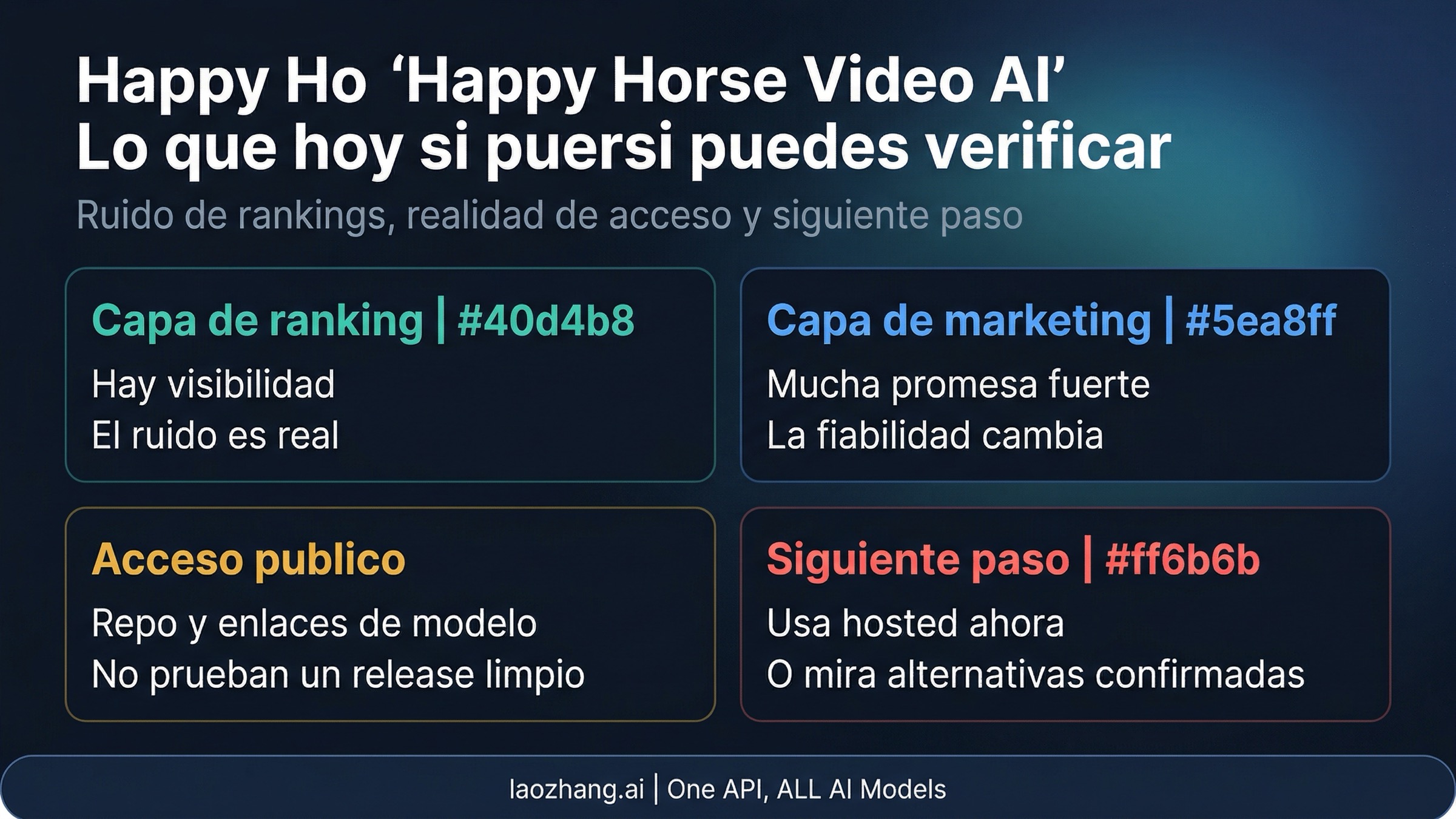 La conclusion mas util no es grandilocuente. HappyHorse hoy tiene mas presencia de mercado que evidencia publica de release. Es decir, se entiende por que el nombre circula, pero no se cierra todavia la parte que te permitiria tratarlo como un modelo publico normal.