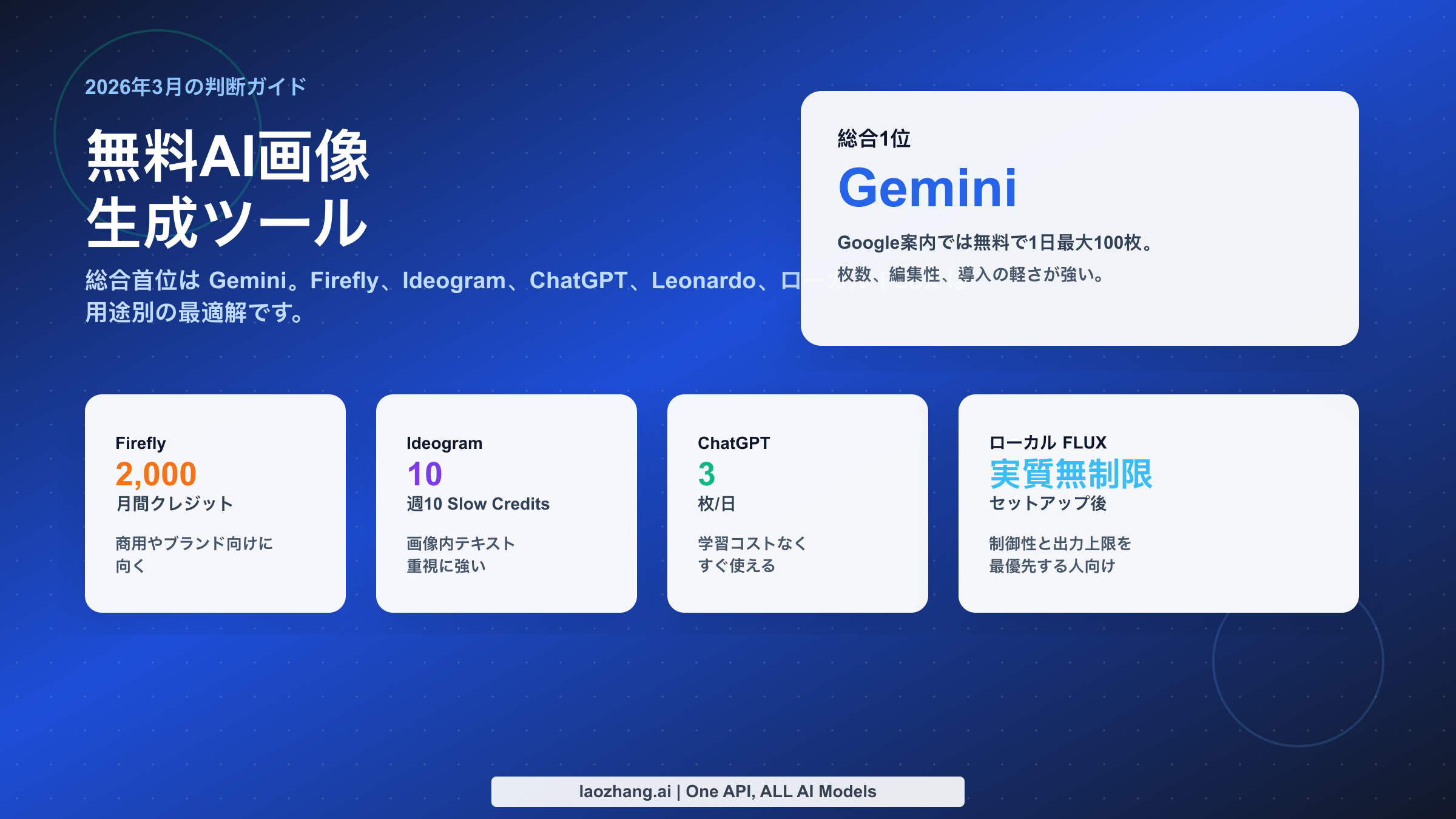 結論を先に言うと、2026年3月12日時点では、多くの人にとって最適な無料AI画像生成ツールは Gemini です。 理由は、一般ユーザー向けサービスとして確認できる無料枠が広く、テキスト描画と対話編集の実用性が高く、導入の摩擦が小さいからです。ただし「何を最優先するか」で最適解は変わります。商用案件の安心感を重視するなら Adobe Firefly、画像内テキストの強さを重視するなら Ideogram、操作の簡単さを最優先するなら ChatGPT、遊びながら細かく試したいなら Leonardo、そして「上限そのものを消したい」ならローカル FLUX / Stable Diffusion が有力です。