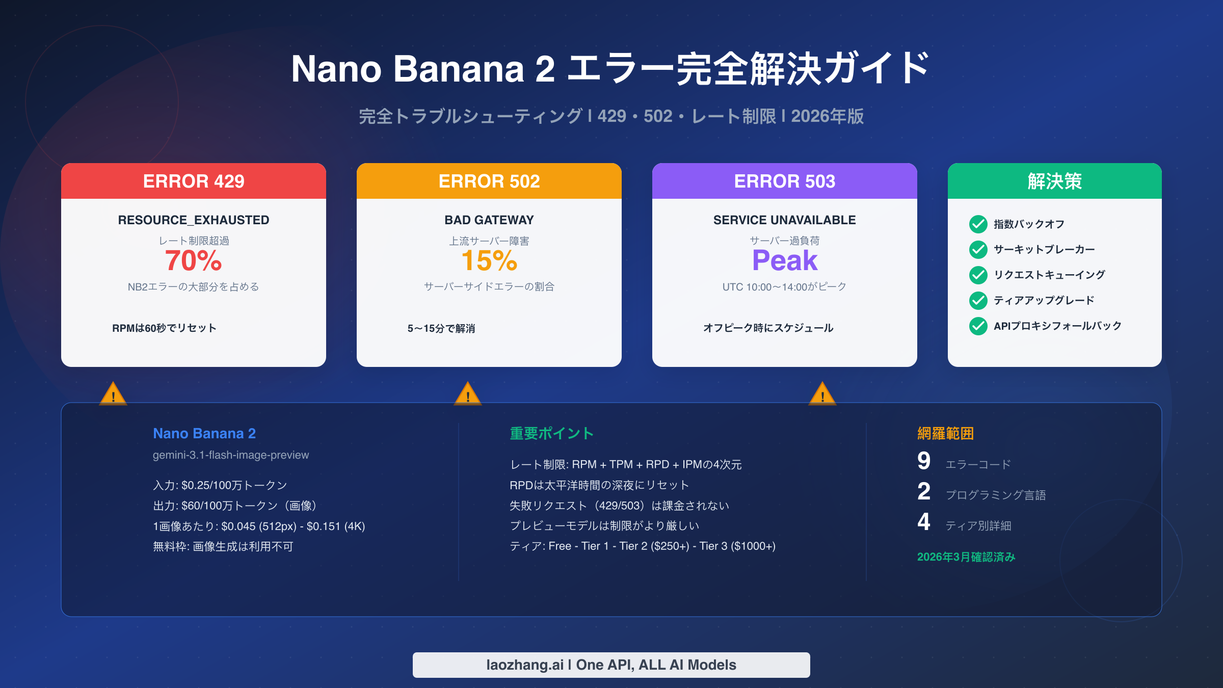 Nano Banana 2で発生する429 RESOURCE_EXHAUSTEDや502 Bad Gatewayなどのエラーは、Gemini 3.1 Flash Image API(gemini-3.1-flash-image-preview)に影響を及ぼします。429エラーは全障害の約70%を占め、レート制限を超過したことを意味します。RPMリセットには60秒待つか、日次クォータ(太平洋時間の深夜にリセット)を確認してください。502エラーはGoogleサーバーの不正なレスポンスを示し、通常5〜15分で解消されます。本ガイドでは、検証済みのレート制限データ、実際のエラーレスポンス例、本番環境対応のPython・TypeScriptコードを使って、Nano Banana 2のすべてのエラーコードを網羅的に解説します。