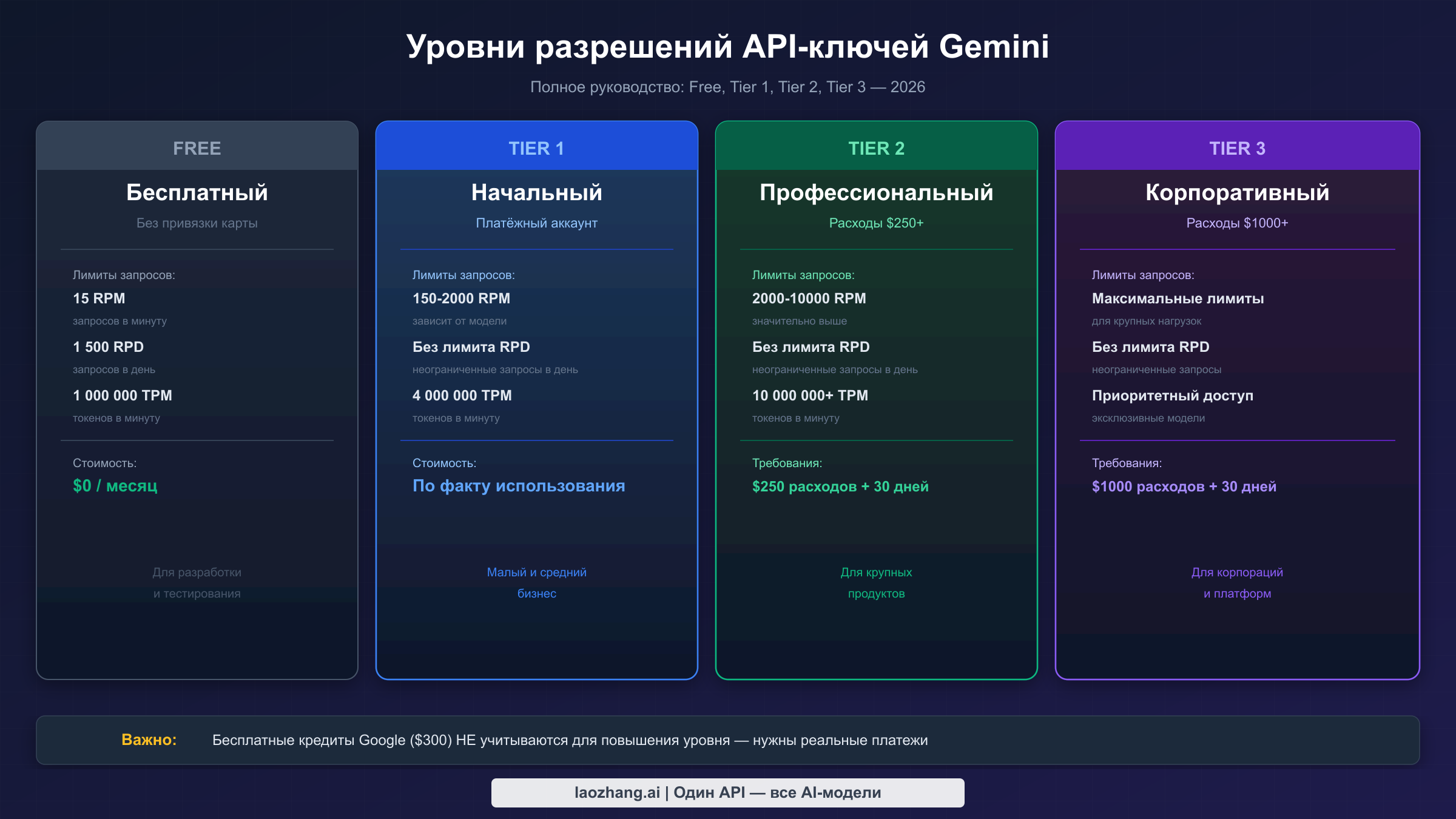 Gemini API использует четырёхуровневую систему, определяющую ограничения запросов, доступные модели и доступ к расширенным функциям. Каждый уровень привязан к истории биллинга конкретного проекта Google Cloud, а не к личному аккаунту. Это важно понимать, поскольку многие разработчики ошибочно полагают, что бесплатные пробные кредиты Google Cloud ($300) засчитываются при обновлении уровня — это не так. Прогресс по уровням отслеживается отдельно на основе реальных списаний с платёжного метода.