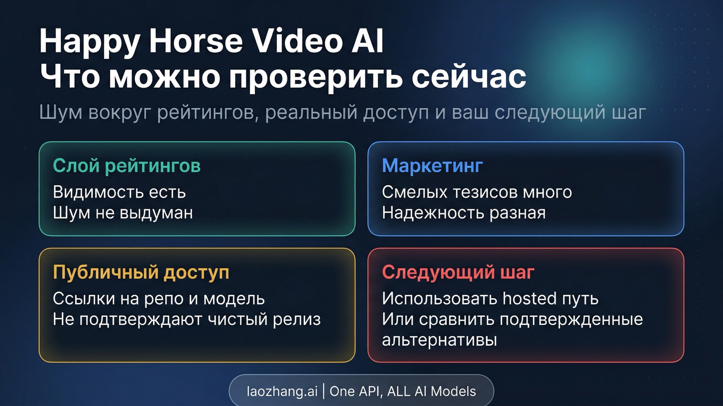 | Я хочу просто попробовать, что скрывается за шумом вокруг HappyHorse | Смотрите на живую поверхность HappyHorses как на hosted-продукт | Это самый понятный доступный маршрут для реального использования сейчас | Не считайте hosted-доступ автоматическим доказательством публичного релиза |