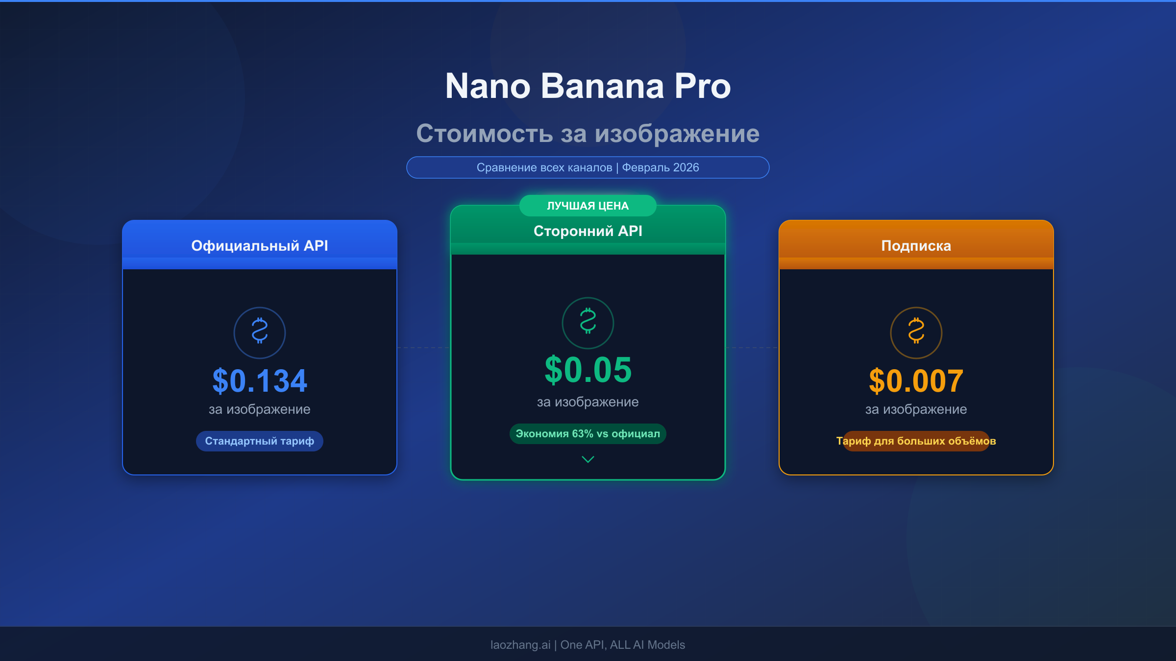 Стоимость одного изображения варьируется от $0,003 до $0,24 в зависимости от способа доступа. Через официальный API Google изображение 2K стоит $0,134, а 4K — $0,24 (страница цен Google AI Developer, проверено 25 февраля 2026 года). Подписка AI Pro за $19,99/месяц предоставляет примерно 3000 изображений, что составляет около $0,007 за каждое. Сторонние провайдеры, такие как laozhang.ai, берут $0,05 за изображение любого разрешения. Самая низкая стоимость за изображение — через подписку AI Ultra, примерно $0,003 при полном использовании.