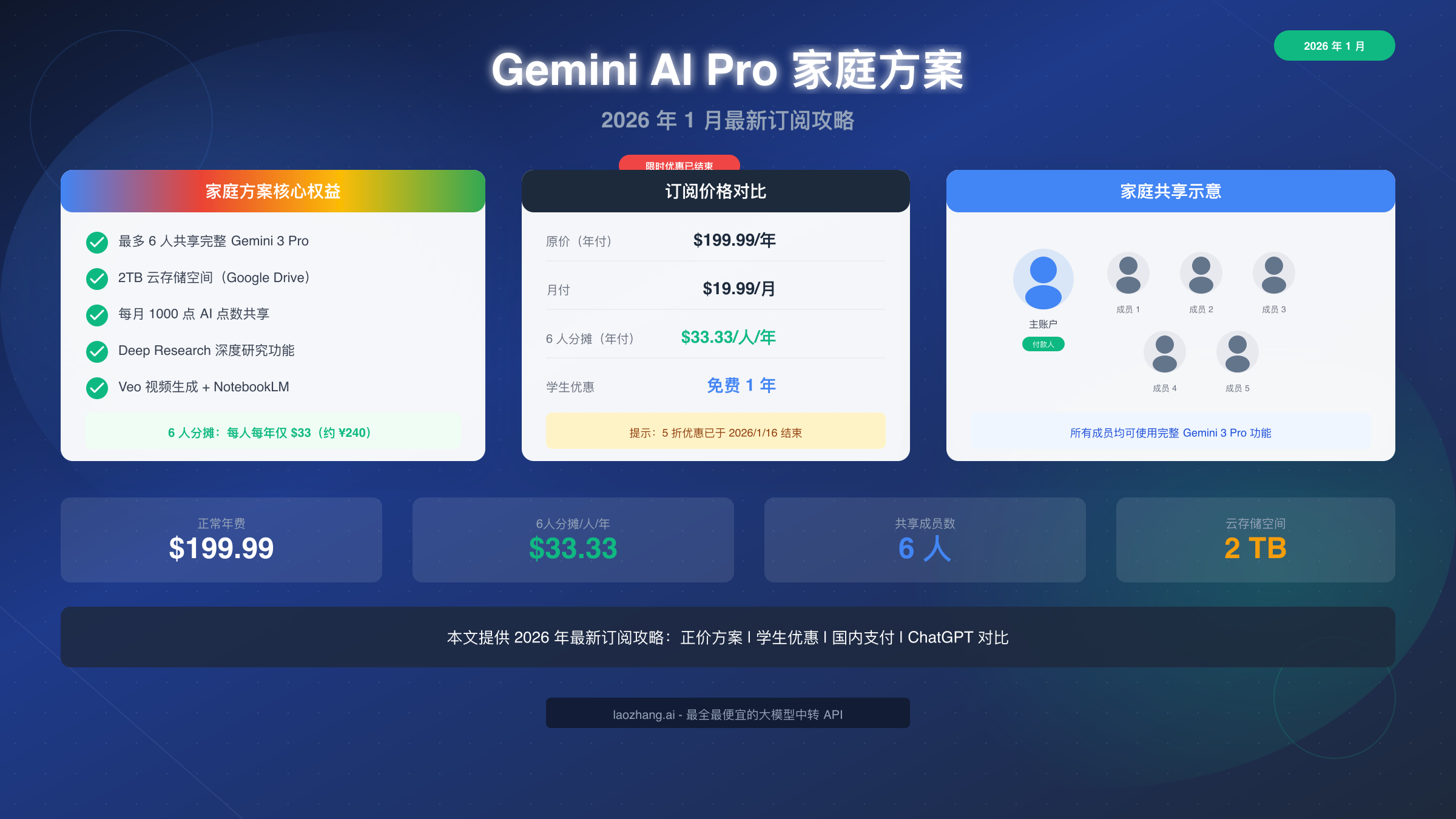 Google Gemini AI Pro 家庭方案是目前市面上性价比最高的 AI 订阅选择之一,允许最多 6 人共享 Gemini 3 Pro 完整功能和 2TB 云存储。2026 年 1 月 16 日的限时 5 折优惠虽然已经结束,但正常价格下 6 人分摊每人每年仅需 $33(约 ¥240),仍然远低于单独订阅任何 AI 服务的成本。本文将详细介绍当前最优的订阅方式、完整的家庭共享设置流程、国内用户的支付解决方案,以及与 ChatGPT Plus 的全面对比分析。