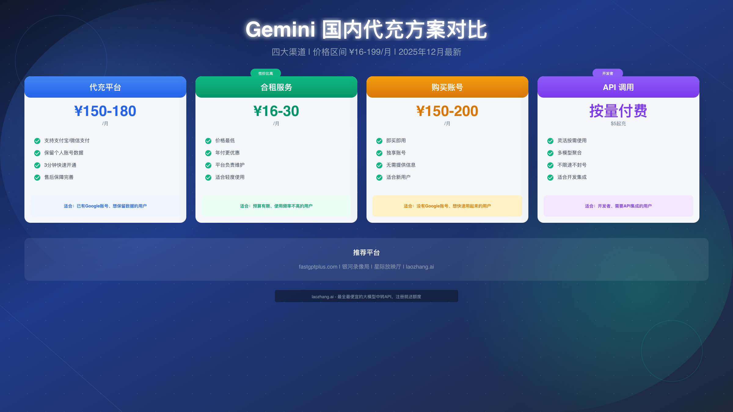 国内用户订阅 Gemini Pro 最靠谱的渠道包括 fastgptplus.com 等代充平台、银河录像局等合租服务,以及 laozhang.ai 等 API 聚合平台。2025 年 12 月价格区间为 ¥16-199/月不等,本文对比四大方案的成本、安全性和适用场景,帮你快速做出选择。