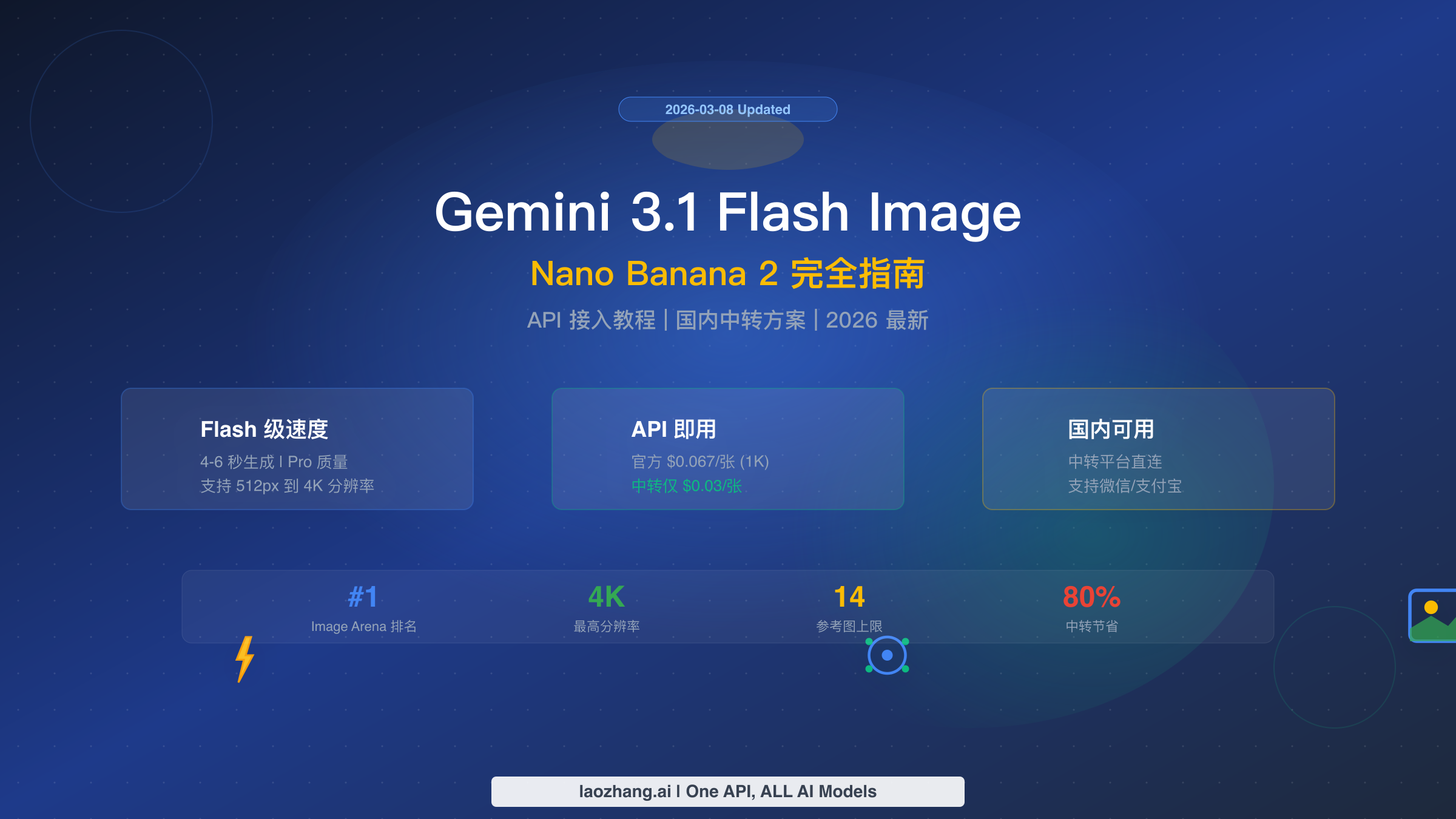 Gemini 3.1 Flash Image(代号 Nano Banana 2)是 Google 于 2026 年 2 月 26 日发布的最新 AI 图片生成模型,凭借 Flash 级速度(4-6 秒)和接近 Pro 的图片质量,迅速登顶 Chatbot Arena Image 排行榜第一名。本文将从 API 接入、价格解析、国内方案到生产实践,为中文开发者提供一站式完整指南——官方 1K 图片定价 $0.067/张,而通过中转平台最低仅需 $0.03/张(Google AI 官网,2026-03-08 验证)。