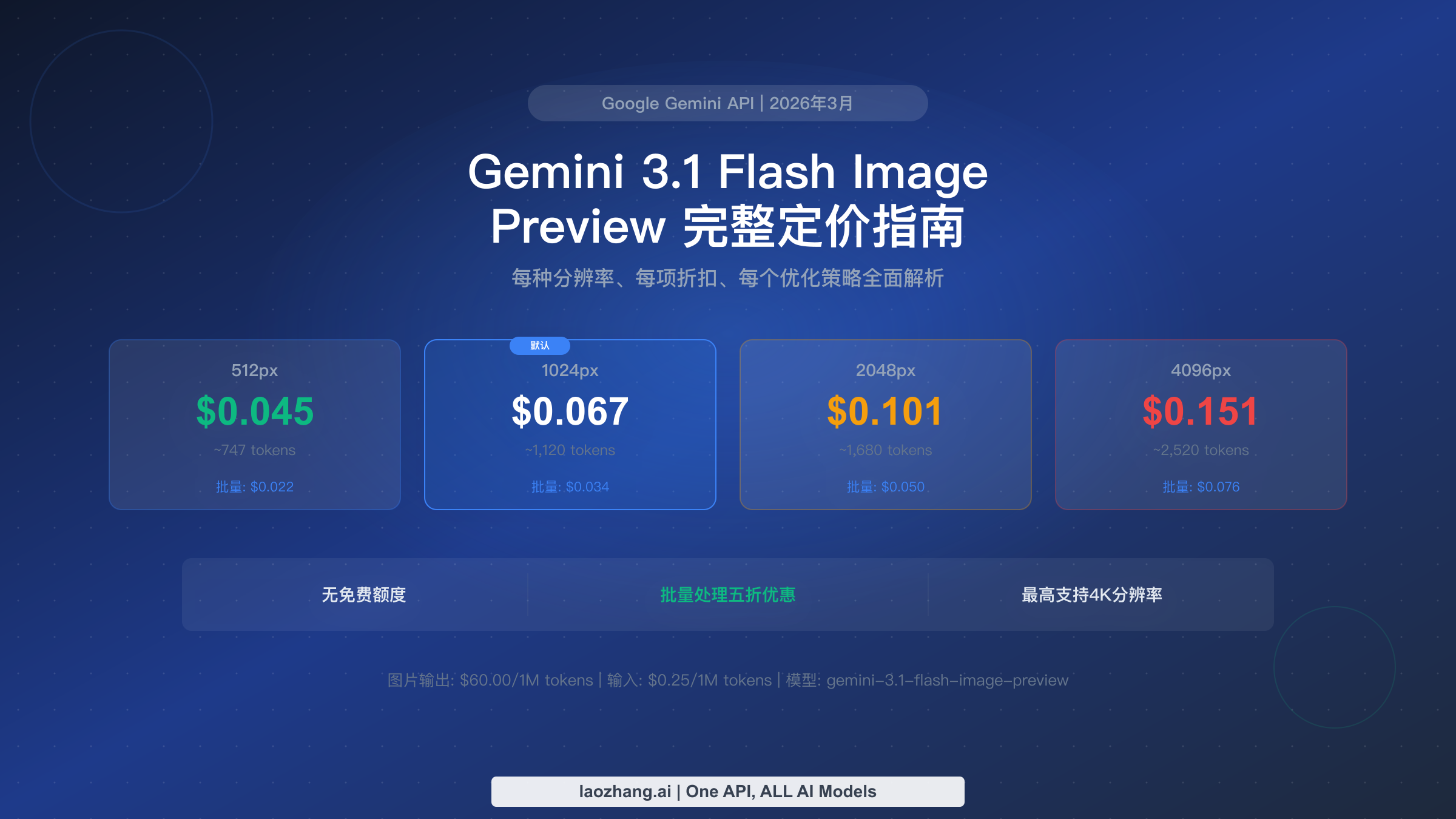 Gemini 3.1 Flash Image Preview 每张生成图片的费用在 $0.045 到 $0.151 之间,基于 Google 每百万输出图片 token $60 的费率计算得出。默认 1024px 图片每张 $0.067,使用批量处理可降至 $0.034,即固定五折优惠。截至2026年3月,该模型没有免费额度,且 Google AI Studio 与 API 文档之间存在的定价差异至今未获官方解释。本指南详细拆解每种分辨率下的精确成本,将定价与10款竞品模型进行横向对比,并提供可将图片生成费用降低最高67%的实操策略。