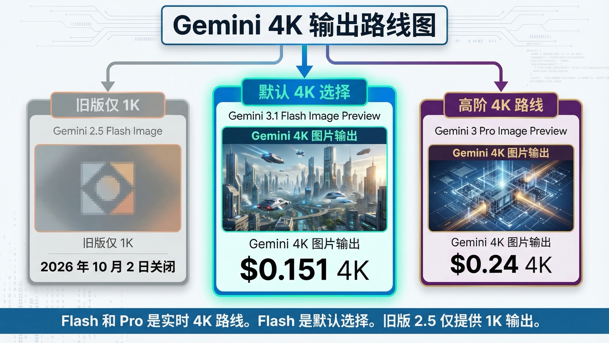 老的 gemini-2.5-flash-image 则是另一回事。Google 当前的 pricing 页面仍然把它写成最多 1024x1024 输出,而 deprecations 页面 还写明它会在 2026 年 10 月 2 日关闭,官方推荐替代模型是 gemini-3.1-flash-image-preview。也就是说,如果你的问题是“现在做 4K 图到底该用哪个 Gemini 模型”,2.5 这条路线只剩历史背景价值和便宜 1K 的遗留价值,不再是当前 4K 的正解。