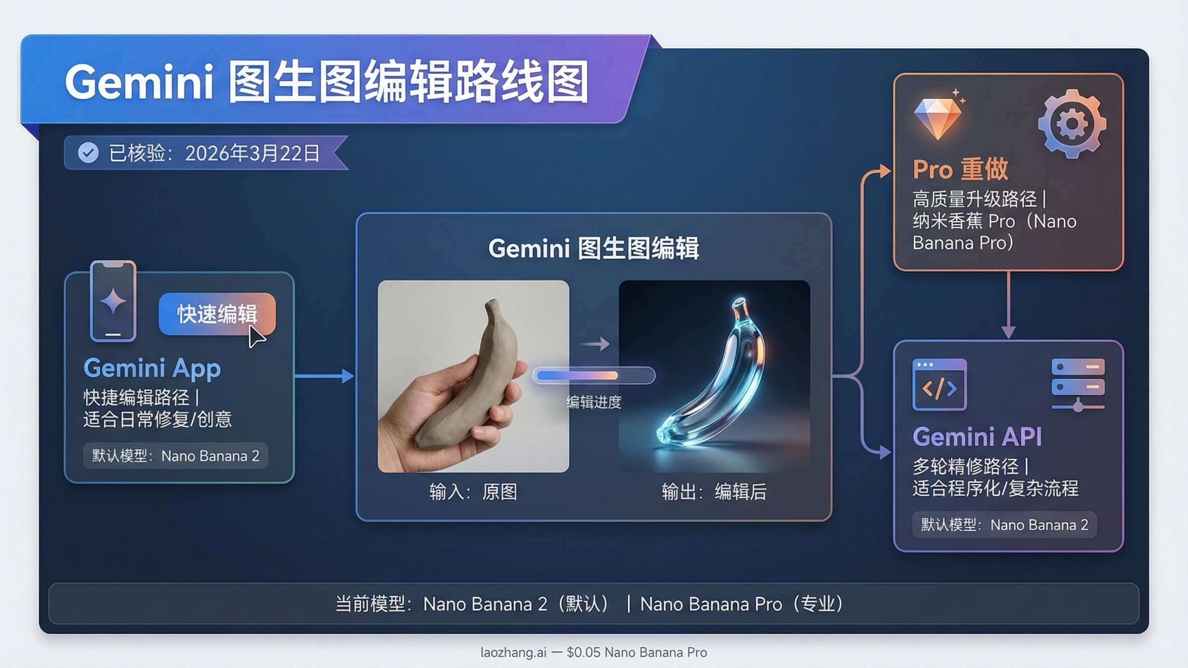 可以。Gemini 现在已经能做图生图编辑,而且对大多数用户来说,最稳妥的默认路线就是 Nano Banana 2。 截至 2026 年 3 月 22 日,真正需要先判断的,不是“Gemini 到底支不支持图片编辑”,而是你应该走 Gemini App、Gemini API,还是在需要更高质量时升级到 Nano Banana Pro。