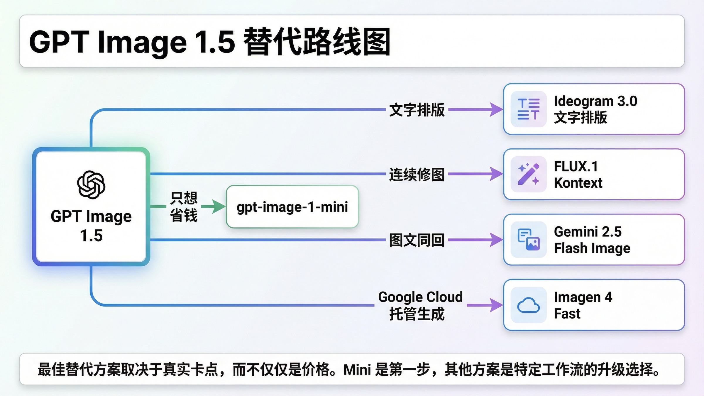 截至 2026 年 3 月 26 日,GPT Image 1.5 的最佳替代方案取决于到底哪里出问题了。 如果你唯一不满意的是价格,不要急着换平台。OpenAI 自己的 gpt-image-1-mini 仍然是当前官方最便宜的图像入口。只有当 GPT Image 1.5 在某个工作流维度上已经不适合你时,切换才真正有意义:做海报、封面和版式图时先测 Ideogram 3.0;高频修图和角色一致性更看 FLUX.1 Kontext;一轮里要同时返回文字和图片时看 Gemini 2.5 Flash Image;想把托管生成放进 Google Cloud 时看 Imagen 4 Fast。