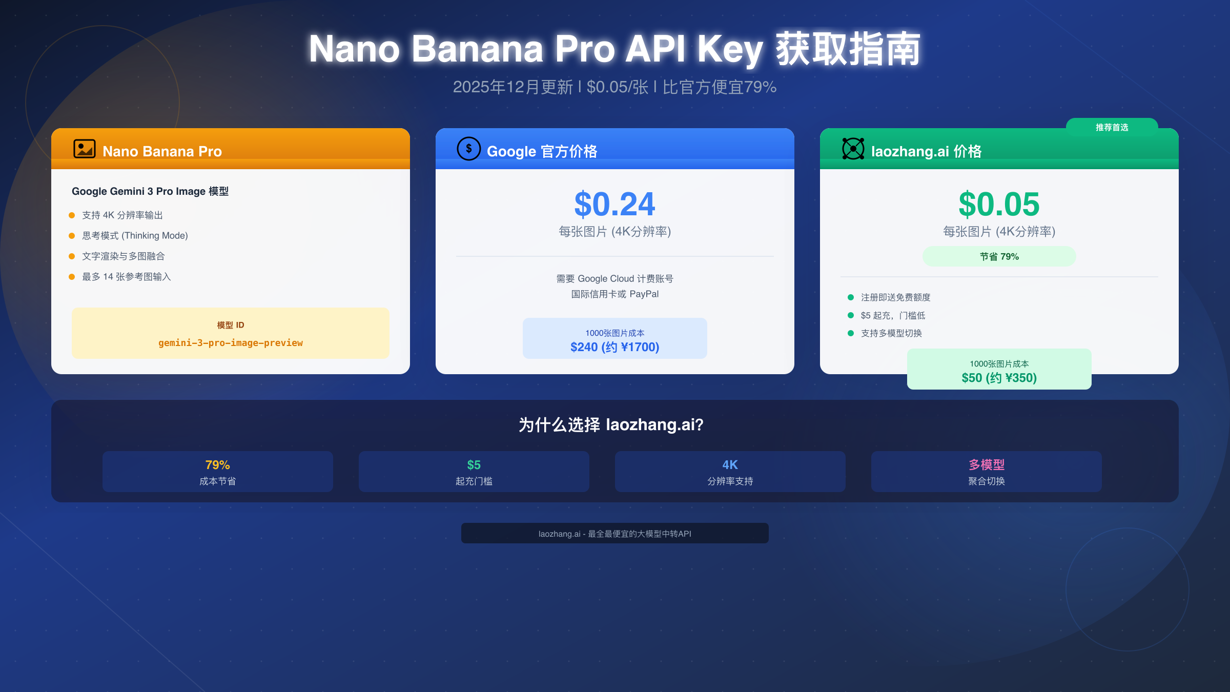 通过本文的详细介绍,你应该已经了解了如何获取 Nano Banana Pro API Key 的多种方法。对于大多数用户来说,通过 laozhang.ai 这样的第三方平台接入是最经济实惠的选择。$0.05/张的价格、$5 的低充值门槛、注册送额度的福利,让每个人都能以极低成本体验 Nano Banana Pro 的强大图像生成能力。现在就访问 laozhang.ai 注册账号,开始你的 AI 图像生成之旅吧!