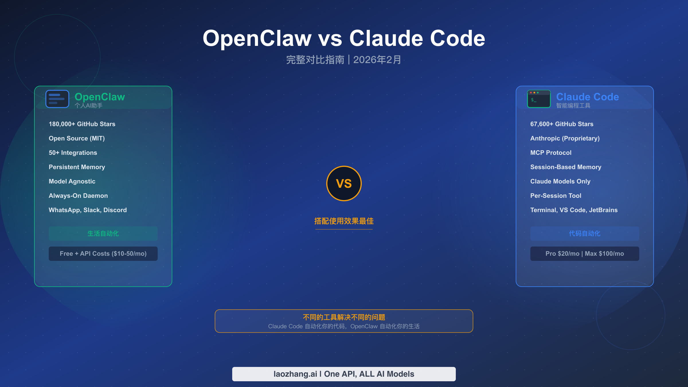 不能,因为它们解决的是根本不同的问题。Claude Code 不能访问你的邮件、管理你的日历、控制你的智能家居或自动化非编程工作流——它没有与消息平台的集成,没有跨会话的持久化记忆,也没有在你离开时处理任务的后台守护进程。OpenClaw 不能深度理解代码库、跨多个文件重构、编写全面的测试或管理复杂的Git操作——它缺少使 Claude Code 作为编程智能体有效运作的深度文件系统访问、上下文压缩和代码专用提示。试图将一款工具用于另一款的用途会导致令人沮丧的体验。正确的定位不是替代而是互补——每款工具消除日常工作流中不同类别的摩擦。