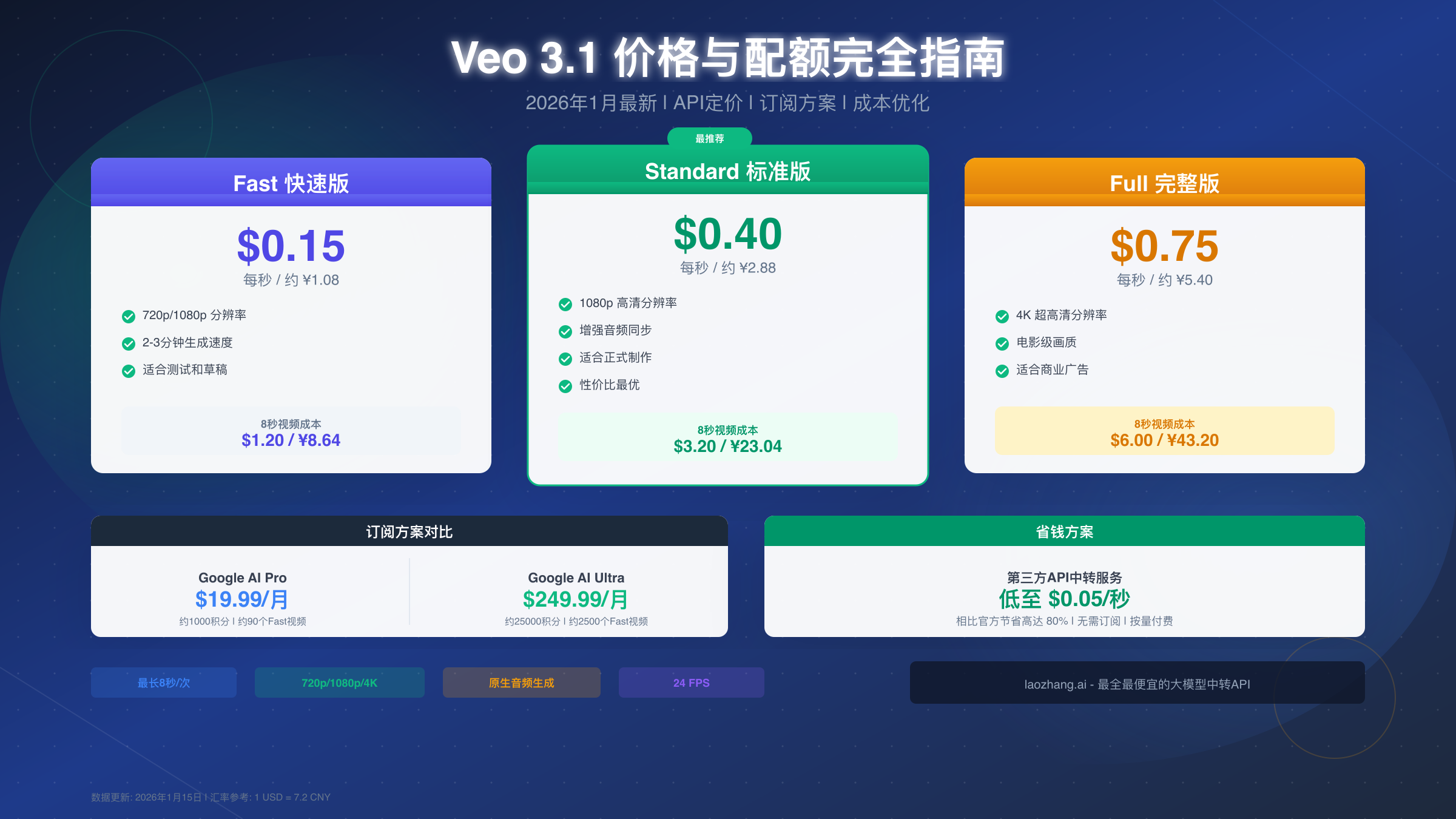 Google Veo 3.1 的 API 定价分为三个层级:Fast 版每秒 $0.15(720p/1080p),Standard 版每秒 $0.40(1080p 增强),Full 版每秒 $0.75(4K 电影级)。订阅方案方面,Google AI Pro 每月 $19.99 提供约 1000 积分,AI Ultra 每月 $249.99 提供约 25000 积分。根据 Google 官方文档(2026年1月更新),通过第三方 API 中转服务可实现低至 $0.05/秒的成本,相比官方节省高达 80%。本指南将帮助你全面理解 Veo 3.1 的定价结构、配额限制,并提供最优方案选择建议。